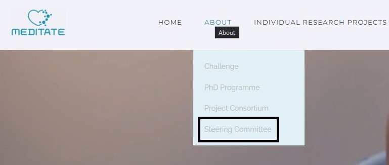 The section Steering Committee can be reached from the MeDiTATe website homepage by pointing the mouse on the ABOUT section on the header and then clicking on Steering Committee, as shown in the image below.